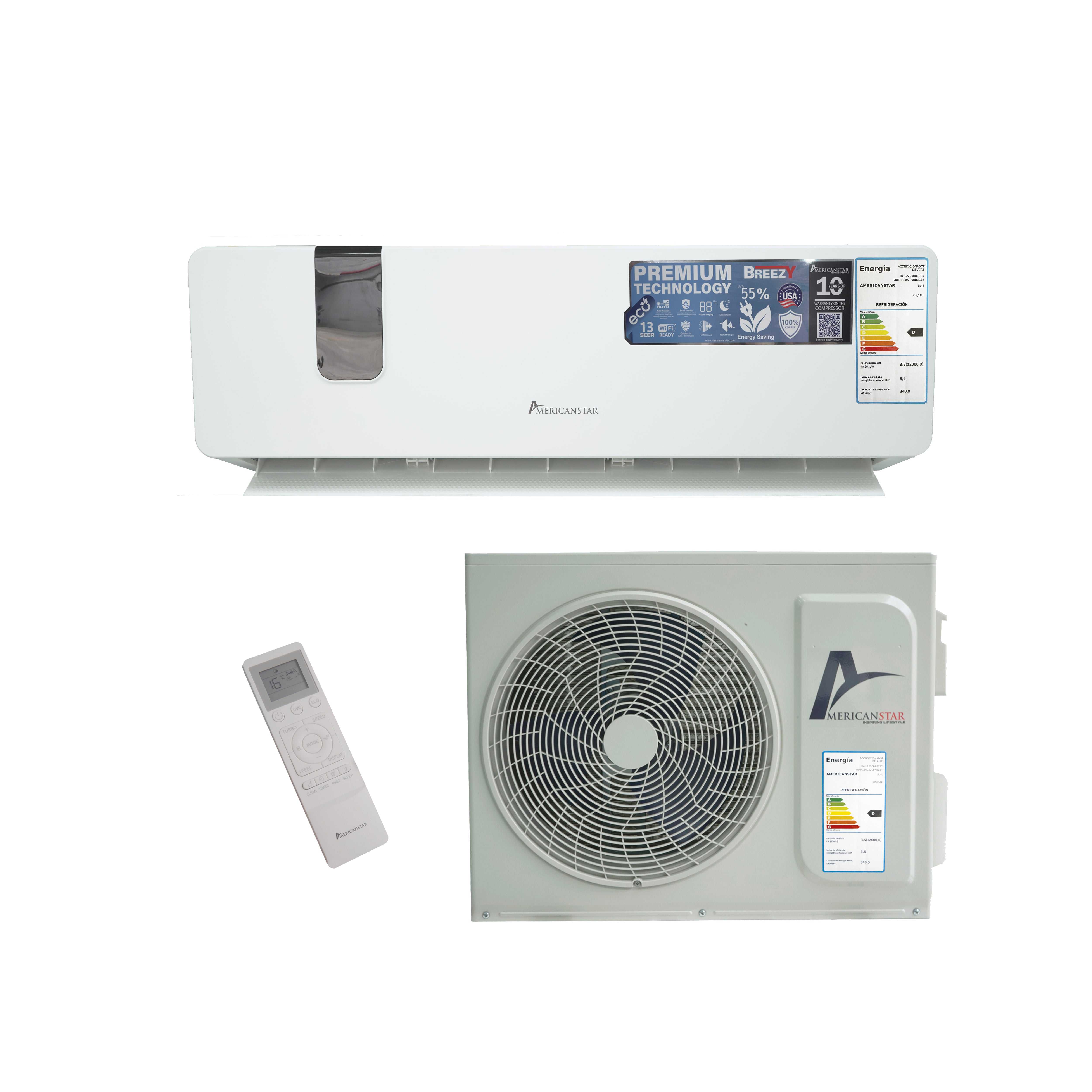 Disfruta del confort superior con el aire acondicionado Americanstar Modelo Breezy de 12.000 BTU, un equipo PREMIUM que combina eficiencia ecológica, alto rendimiento y diseño moderno. Ideal para espacios de 16 a 20 m², ofrece una refrigeración potente con bajo consumo energético.