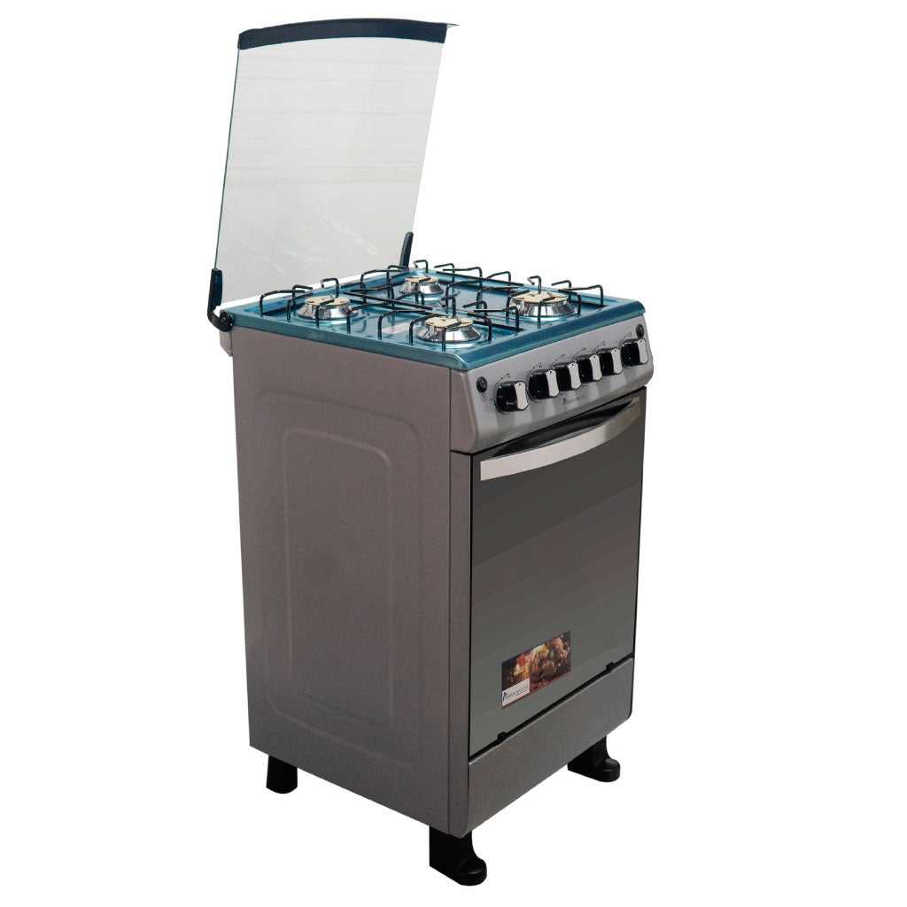 Cocina 4 quemadores gris con grill en el horno