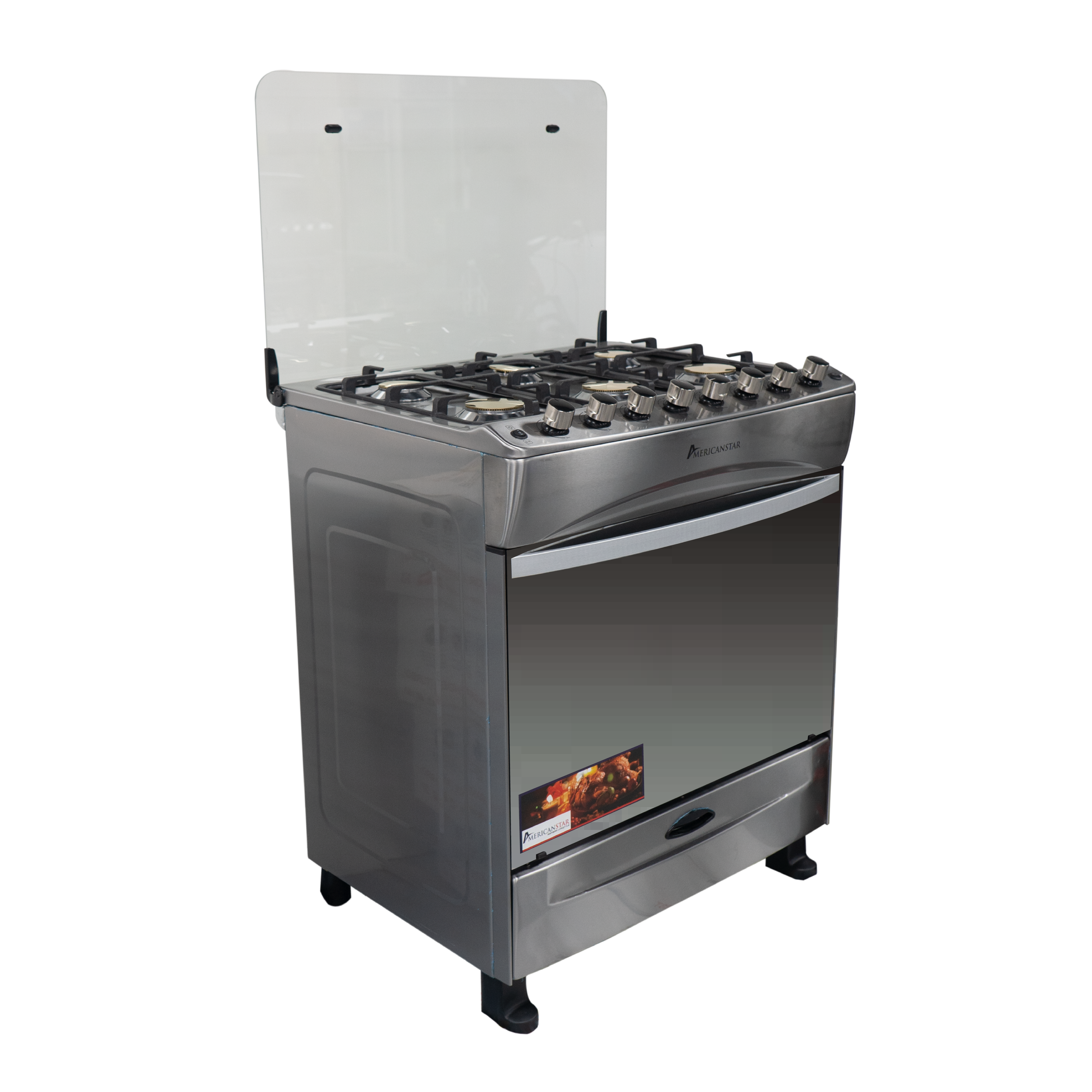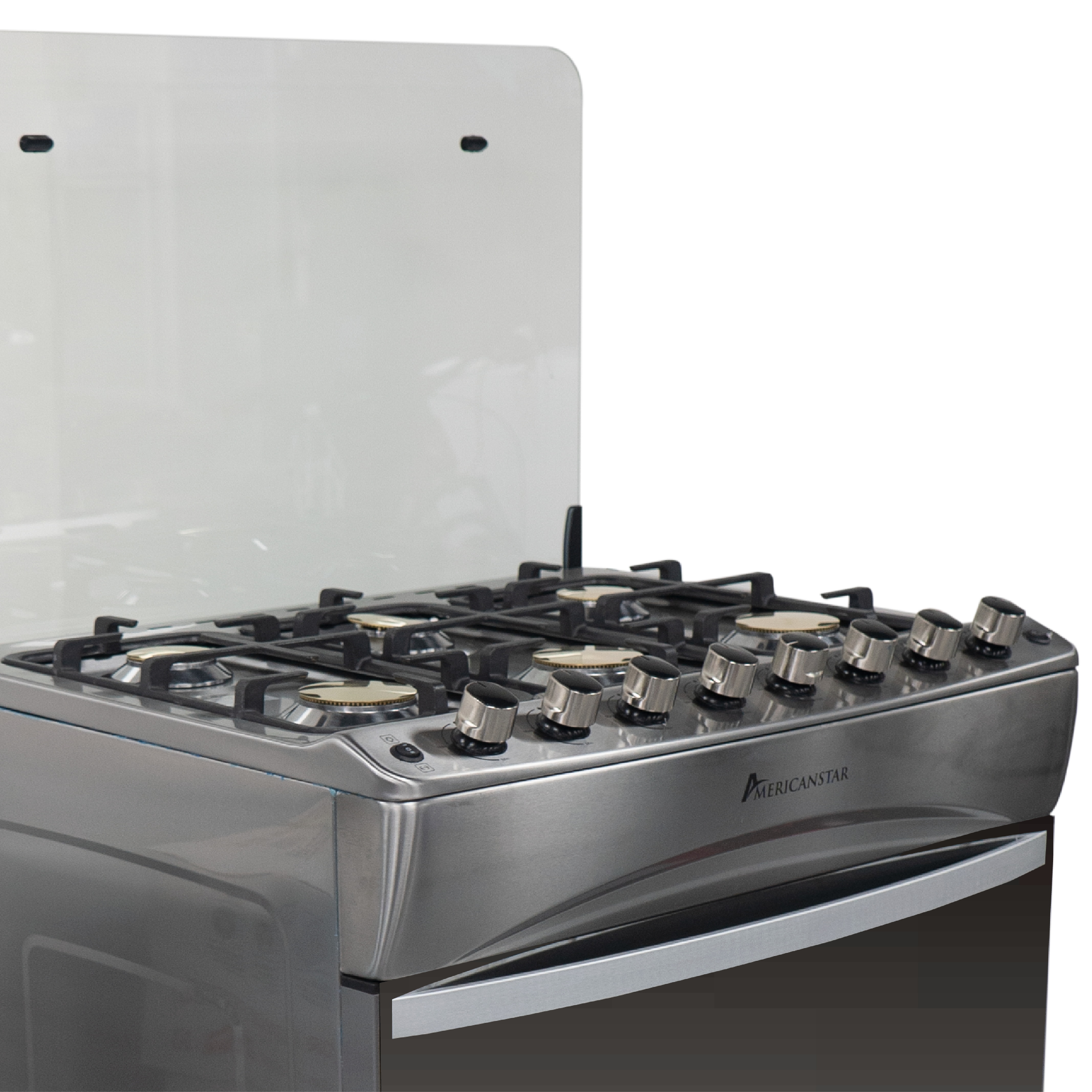 Nuestra cocina AmericanStar 30″ acerada, cuenta con 6 parrillas reforzadas, para una mayor durabilidad, así como 6 quemadores (3 grandes y 3 medianos) que permite la distribución de manera uniforme a la hora de cocinar. De igual forma, su cuerpo es completamente de acero inoxidable con perillas metálicas, para un acabado elegante y duradero.