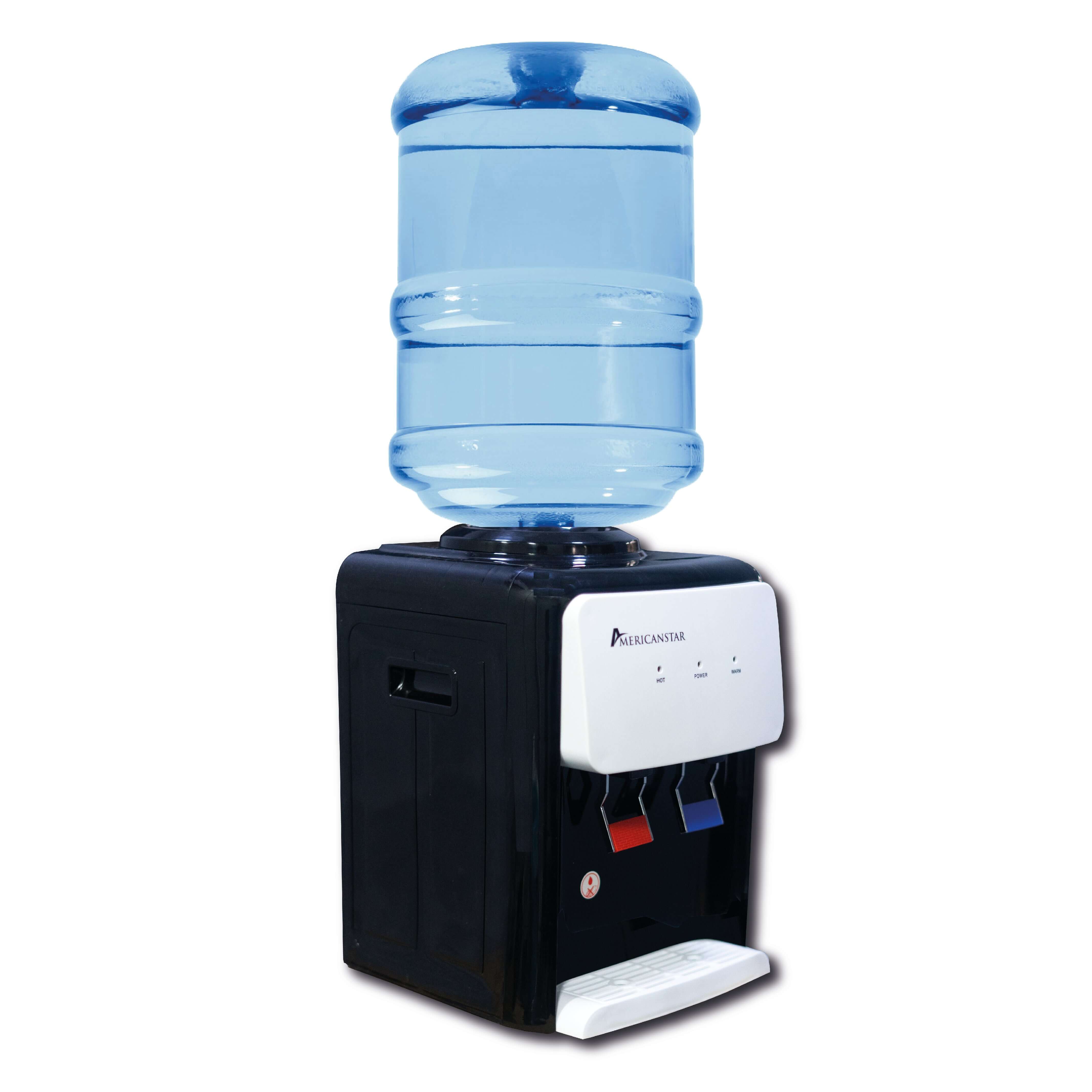 Con el nuevo dispensador de agua, de mesa AmericanStar, usted podrá obtener instantáneamente agua para sus bebidas y agua caliente para té y sopas. Su sistema calienta hasta los 90°C.   Soporta botellones de 3 a 5 galones en la parte superior.