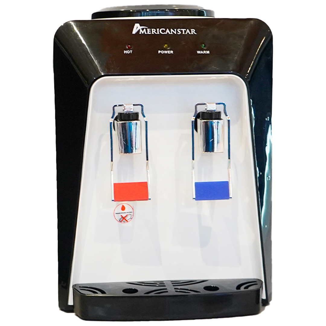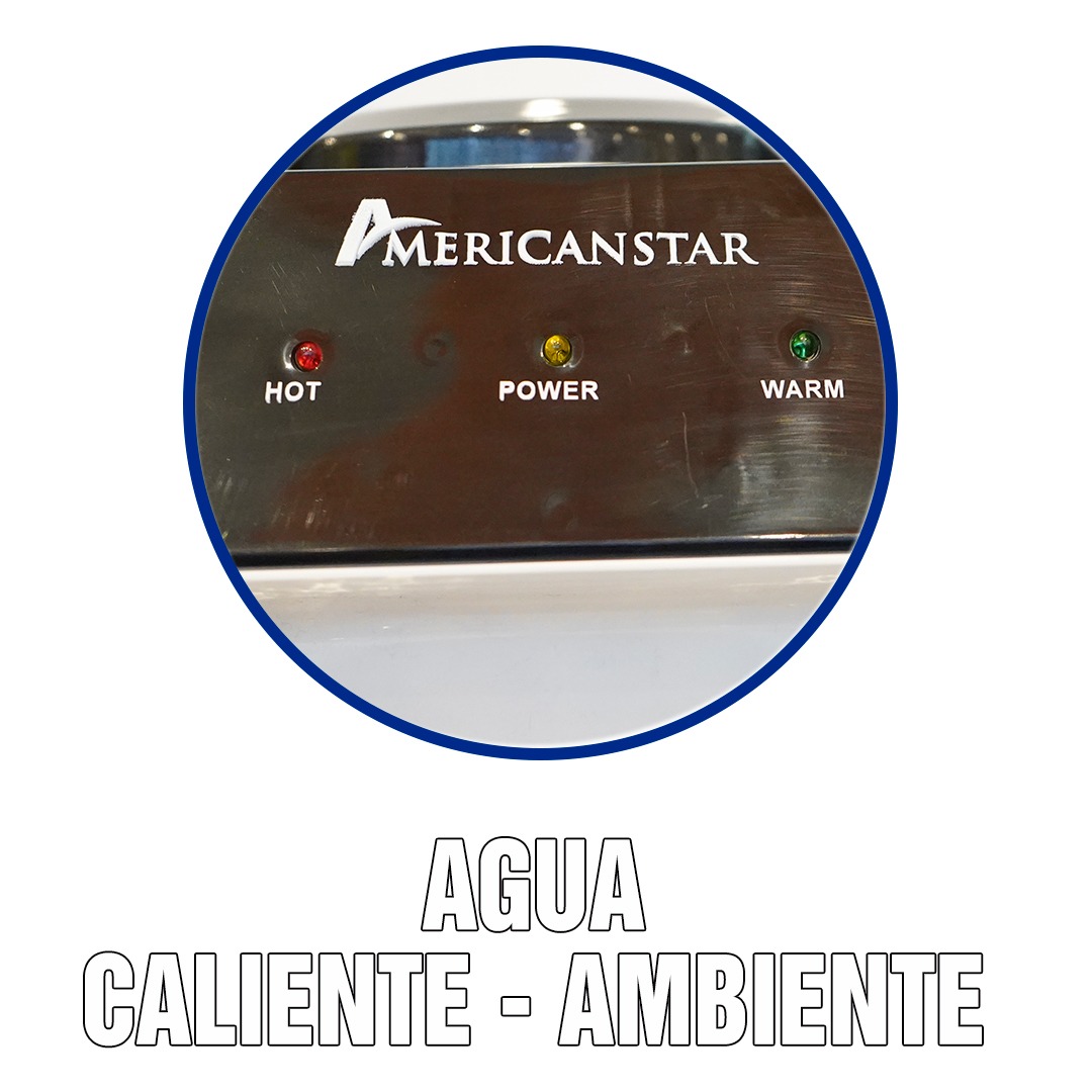 Con el nuevo dispensador para mesa American Star, usted podrá obtener instantáneamente agua para sus bebidas, o caliente para té y sopas. Su sistema calienta hasta los 90°C. Soporta botellones de 3 a 5 galones en la parte superior.